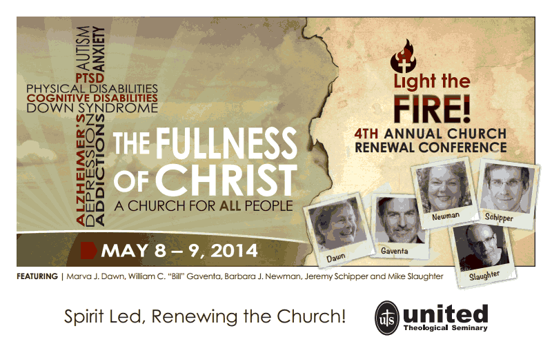 Speakers will include Marva Dawn, Bill Gaventa, Barb Newman, Jeremy Schipper, and Mike Slaughter. We will also have breakout sessions on ministry with people who are experiencing PTSD, depression, autism, and Alzheimers/dementia, as well as sessions on setting up a disability-friendly church and establishing recovery ministries.